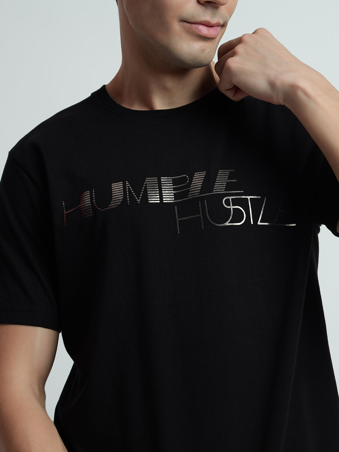 Unleash luxury with Rarebond's Humble Black T-shirt. Made of high-quality cotton, the half-sleeve shirt offers a soft, durable design and long-lasting color. Zero shrinkage ensures a premium experience. Showcase our sophisticated, regular fit with minimal embroidery for an exclusive addition to your wardrobe. With unique Metallic HD print style , elevate your style to new heights.